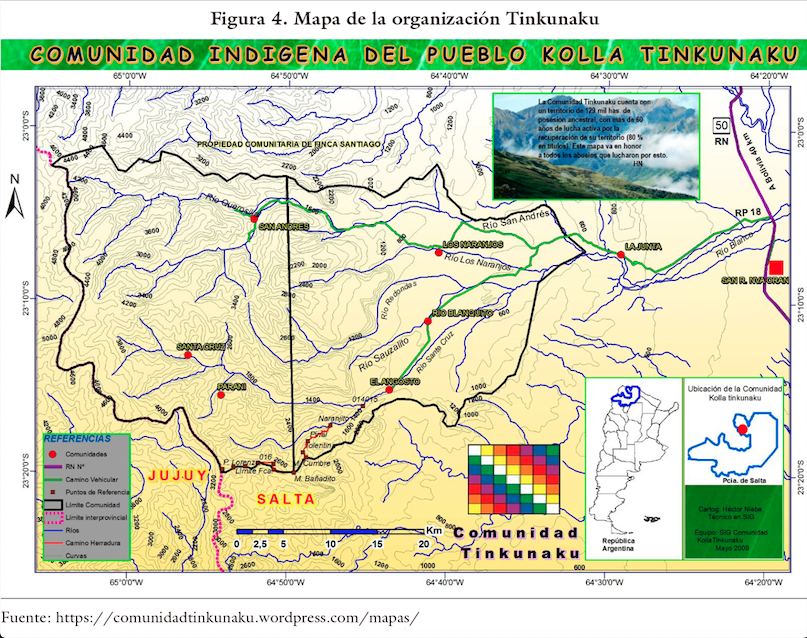 A fines de la década, lograron inscribirse las primeras personerías jurídicas nacionales kollas16 en el Registro Nacional de Comunidades Indígenas (Renaci): la Comunidad Indígena del Pueblo Kolla Finca Santiago (Res.633.-28/02/97), que logró la restitución de dicha finca como propiedad comunitaria en 1998; la Comunidad Indígena del Pueblo Kolla Tinkunaku (Res.4091.-26/10/97), que obtendría los títulos comunitarios con la expropiación de la Finca San Andrés en 2007 (figura 4), y la Asociación de Comunidades Aborígenes de Nazareno u OCAN (Res. 4084.30/12/1998), aun en lucha por los títulos de la Finca Santa Victoria.