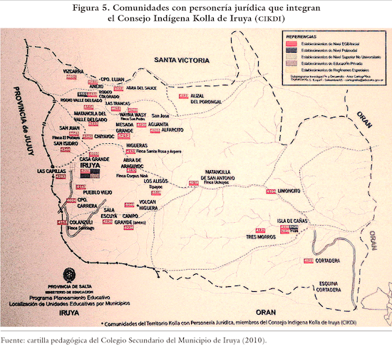 En Iruya, el PAS estuvo presente desde 1996 y se ejecutaba en articulación con otros programas de desarrollo. Su radio de acción se incrementó en los territorios donde se había logrado acceder a los títulos comunitarios, que permitió ejecutar una mayor cantidad de proyectos. Uno de los más relevantes fue el Proyecto de Desarrollo de Comunidades Indígenas (dci).18 En este contexto se creó el Consejo Indígena Kolla de Iruya (cikdi) (figura 5), organización de segundo grado que desde el 2004 busca representar a las comunidades del departamento, intercambiar información y vincularse con organizaciones no gubernamentales e instituciones estatales, realizando seguimientos y evaluaciones a los proyectos “para el propio desarrollo que las comunidades quieren” (asamblea del cikdi, abril de 2012).