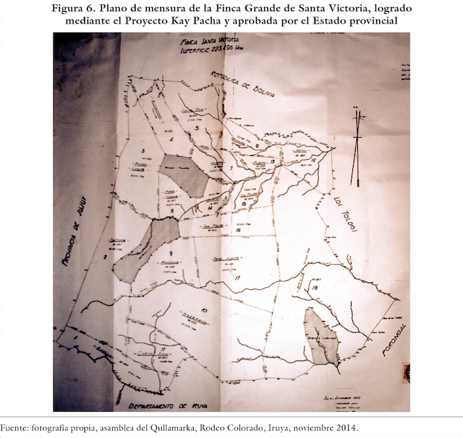 Previamente, en 2003, el PAS, Oclade y Endepa incentivaron la realización del primer acercamiento entre las comunidades del departamento de Santa Victoria Oeste: el Encuentro de Comunidades Aborígenes de Nazareno y Santa Victoria. Con el objetivo de trabajar conjuntamente para lograr los títulos comunitarios de la Finca Santa Victoria, se organizaron capacitaciones, disertaciones y tratamiento de las legislaciones de derechos indígenas, además de la participación de funcionarios del Estado y una creciente presencia de comunidades del municipio de los Toldos. En estos encuentros participó el abogado Rodrigo Solá, actualmente miembro de Endepa y de la Asociación de Abogados de Derecho Indígena (AADI), quien, en el marco de un convenio entre la OCAN, el PAS y la Universidad Nacional de Salta (UNS), elaboró el proyecto Kay Pacha financiado por el INAI, con el que logró trazar el plano de mensura que incluyó a todas las comunidades de la Finca Grande de Santa Victoria (figura 6) y un relevamiento de la situación histórica y jurídica de ellas.
