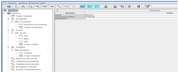 Una vez realizada la conexión a la base de datos se procede a la creación del cubo de datos, iniciando el proceso con la creación de un nuevo esquema. Se añade un cubo que contendrá todos los datos de la tabla de hechos, seguido se añade una tabla que corresponderá a la tabla de hechos que se quiere visualizar. Posteriormente se insertaran las dimensiones existentes en el modelo de estrella, después se agregan los hierarchy de las dimensiones, se crean los niveles que no es más que los elementos que se necesitan y las tablas pertinentes. Posteriormente se realizan las medidas de la tabla de hechos que serían los valores de análisis, en este caso serían los indicadores logísticos en el servicio al cliente más significativos para la entidad, esto se evidencia en la Figura 6.