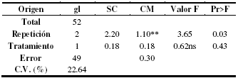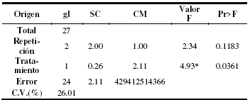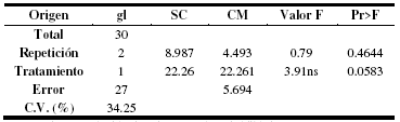 El análisis de la variable NDNDF no fue significativo al Pr<0.05 de probabilidad (tabla 4).