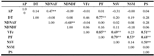 Análisis de correlación. En el análisis de Pearson (tabla 10), se observaron correlaciones altas y significativas para las variables DT versus PF (0.77) esto indicaría que a mayor DT mayor PF posteriormente VFr versus el PF (0.85), NSV (0.69) respecto del PS (0.51) esto evidenciaría que a mayor VFr mayor PF los mismo ocurrió con el NSV y PS. En el PF versus NSV (0.79) y PS (0.68), se estimó que a mayor PF hubo mayor NSV y PS. Visualizando el NSV con PS (0.58), estaría mostrando que a NSV mayor PS (tabla 10).
