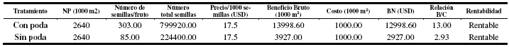Análisis del Beneficio/Costo de los tratamientos. El análisis de rentabilidad de las estrategias para producción de semillas F1 (tabla 11), manifestó que las alternativas que se utilizaron fueron rentables con una relación beneficio/costo mayor a 1 (B/C>1), Se distinguieron los tratamientos con poda con USD 12.998 y sin poda con USD 2.927 (tabla 11).