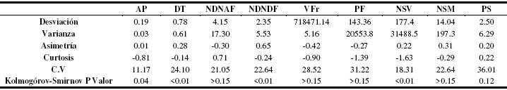 Se observó que en general todas las variables evaluadas manifestaron una curva asimétrica y platicúrtica, y que en general las variables de respuesta revelaron coeficientes de variación (C.V.), que están en el rango permitido para este tipo de investigaciones. La prueba de kosmogorov-Smirnov29, expuso que no hubo significancia al Pr<0.01 de probabilidad. Por lo que se asumió que las variables de respuesta evaluadas exhibieron distribución normal (tabla 1), con coeficientes de variación recomendados para este tipo de investigación.