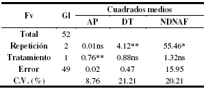 Análisis de varianza. El análisis de varianza de las variables AP, DT y NDNAF, reveló que los coeficientes de variación (8.76 a 20.21) están dentro de los rangos permitidos para este tipo de investigaciones. La variable AP expuso diferencias altamente significativas al Pr<0.01 de probabilidad, lo que estaría indicando que al menos uno de los tratamientos fue diferente (tabla 3).