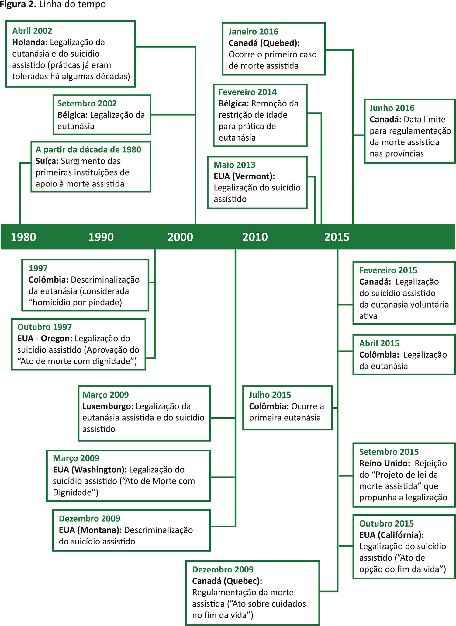 A morte assistida é permitida em quatro países da Europa Ocidental: Holanda, Bélgica, Luxemburgo e Suíça; em dois países norte-americanos: Canadá e Estados Unidos, nos estados do Oregon, Washington, Montana e Vermont; e, na América do Sul, na Colômbia 4. As leis e critérios adotados para a realização dessa prática diferem entre si em cada um desses países. Explicitar a forma como a morte assistida ocorre nesses locais e comparar sua legislação à de outros países semelhantes em aspectos socioeconômico-culturais, permite compreender melhor o assunto, e serve de base para futuros debates 2. A situação do Brasil e do Reino Unido foi abordada ao final do trabalho com o objetivo de contrastar a posição dos demais países e enriquecer a discussão. Para facilitar a compreensão, a linha do tempo com os principais marcos da morte assistida no mundo é apresentada no Anexo 2.