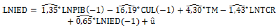 De todas las anteriores, solo cinco resultaron estadísticamente significativas al nivel de confianza en un 5%, estas fueron: logaritmo neperiano del PIB rezagado en un periodo (LNPIB (-1)), costo unitario del trabajo rezagado en un periodo (CUL (-1)), tamaño de mercado (TM), el logaritmo neperiano del tipo de cambio real (LNTCR) y la IED rezagada en un periodo (AR (-1)).