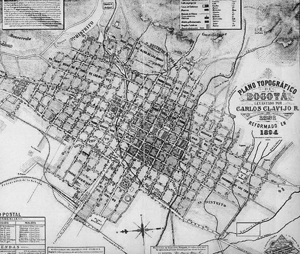 Plano de Bogotá, 1894. Localización del río Fucha (MAZUERA VILLEGAS, FERNANDO, 1972: 1)