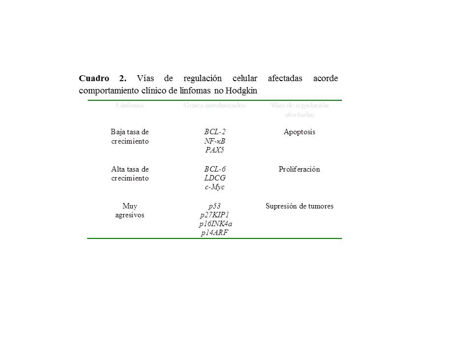 En algunas publicaciones que hablan sobre la desregulación del ciclo celular en los linfomas de células B, a continuación se hace mención a una división de los genes involucrados en la patogenia (Cuadro 2) (58).