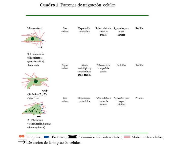 Existen tres patrones de migración celular, sus características e ilustración se encuentran en el Cuadro 1(85,87