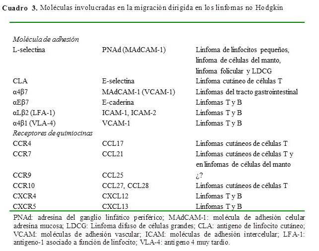 Las moléculas de adhesión, receptores de quimiocinas y las quimiocinas relacionadas con la migración dirigida de los linfomas se presenta en el (Cuadro 3) (85).