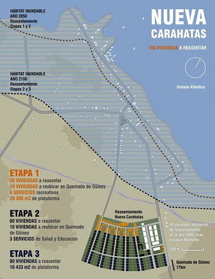 Para la gestión de este riesgo combinado, y considerando las predicciones de aumento, no se recomienda habitar el lugar en el largo plazo (año 2050). Por eso, la alternativa estatal es reasentar al poblado hacia dos destinos que ya formaron parte de procesos anteriores, como evidencia de la búsqueda de soluciones que aprovechen infraestructura y servicios existentes. Las alternativas son hacia el poblado de Lutgardita y a la cabecera municipal, a 5 y 17 km del poblado de origen respectivamente. La primera es parte de un desarrollo agrícola ajeno al hábitat de Carahatas, donde fueron reasentados una parte importante del poblado producto del huracán Kate, en módulos de edificios multifamiliares. (Figura 2).