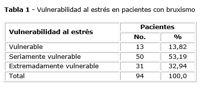 La tabla 1 muestra la vulnerabilidad al estrés que presentan los pacientes diagnosticados con bruxismo, la cual fue de seriamente vulnerable en el 53,19 % del total de la población estudiada.