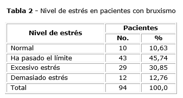 En la tabla 2 se puede observar el nivel de estrés que presentan los pacientes con bruxismo, en la que la categoría "ha pasado el límite", fue de 45,74 % ,seguido de "excesivo estrés" (30,85 %).