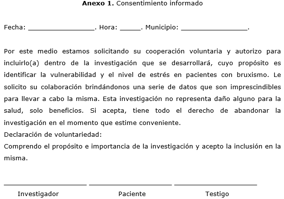 Se tuvo en cuenta como criterios de inclusión: pacientes mayores de 15 años diagnosticados con bruxismo; y como criterios de exclusión: pacientes en tratamientos con ansiolíticos o antidepresivos, pacientes con tratamiento para el bruxismo.