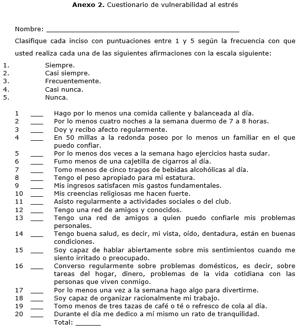 Se calificó con una puntuación de uno a cinco según la frecuencia que el paciente evalúa cada actividad con que realiza cada una de las afirmaciones o el grado que se corresponda con la situación de acuerdo a la escala de evaluación descrita. Fue aplicado además la Escala para valorar el nivel de estrés que se encuentra en el libro antes mencionado (Cuestionario de vulnerabilidad al estrés que se describe en el libro Compendio de instrumentos de evaluación psicológica, de la editorial Ciencias Médicas)(8) (anexo 3); los resultados fueron evaluados por el especialista en Psiquiatría, para lo cual se consideró las categorías: