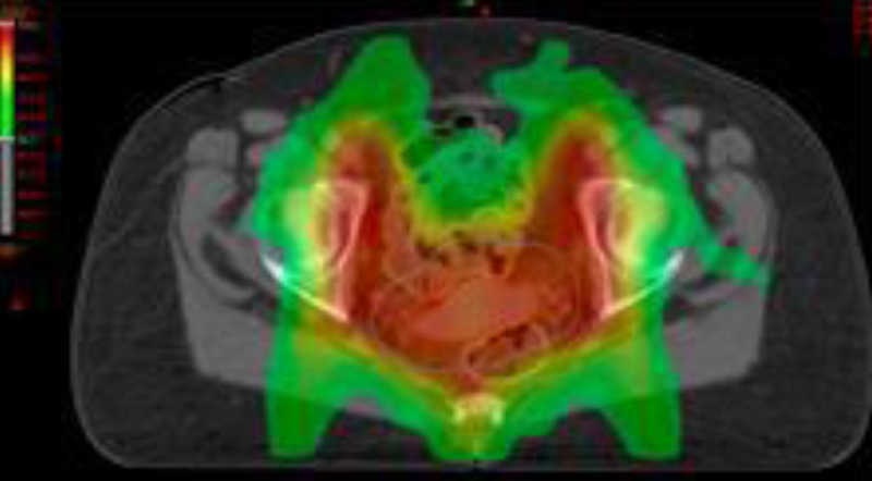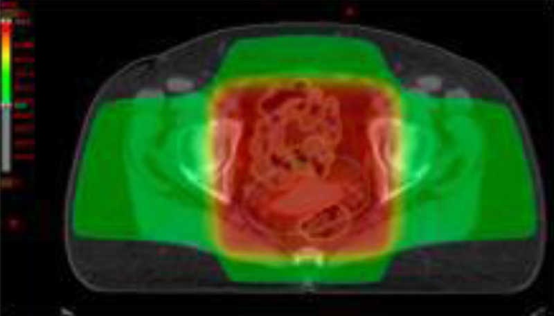 La radioterapia tridimensional conformada (RTC-3D) utiliza un planificador e imágenes de TC de la paciente en posición de tratamiento con inmovilizadores adecuados, para irradiar en forma adaptada, un volumen tridimensional. Se delimitan los volúmenes de interés (volumen a irradiar y órganos de riesgo –OARs-), como recto, vejiga, cabezas femorales e intestino delgado y grueso. Se conforman los haces de radiación de intensidad uniforme sobre el volumen a tratar. El planificador de tratamiento calcula la dosis en tres dimensiones y genera el histograma dosis-volumen (DVH), que representa gráficamente la dosis recibida por cada volumen contorneado, permitiendo la asignación de una dosis determinada a cada volumen particular (fig. 1).