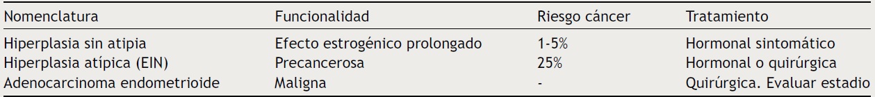 La OMS en el fascículo del año 1994 reconocía 4 subtipos de hiperplasia endometrial: la hiperplasia sin atipia, simple o compleja; o la hiperplasia con atipia, simple o compleja (adenomatosa). En el año 2014 la OMS propuso una nueva terminología para las hiperplasias endometriales en las que se analizaban distintas eventualidades (tabla 1).