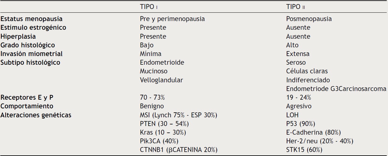 Hallazgos clínicos, epidemiológicos e histológicos permiten dividir al carcinoma endometrial en dos categorías (tabla 2):
