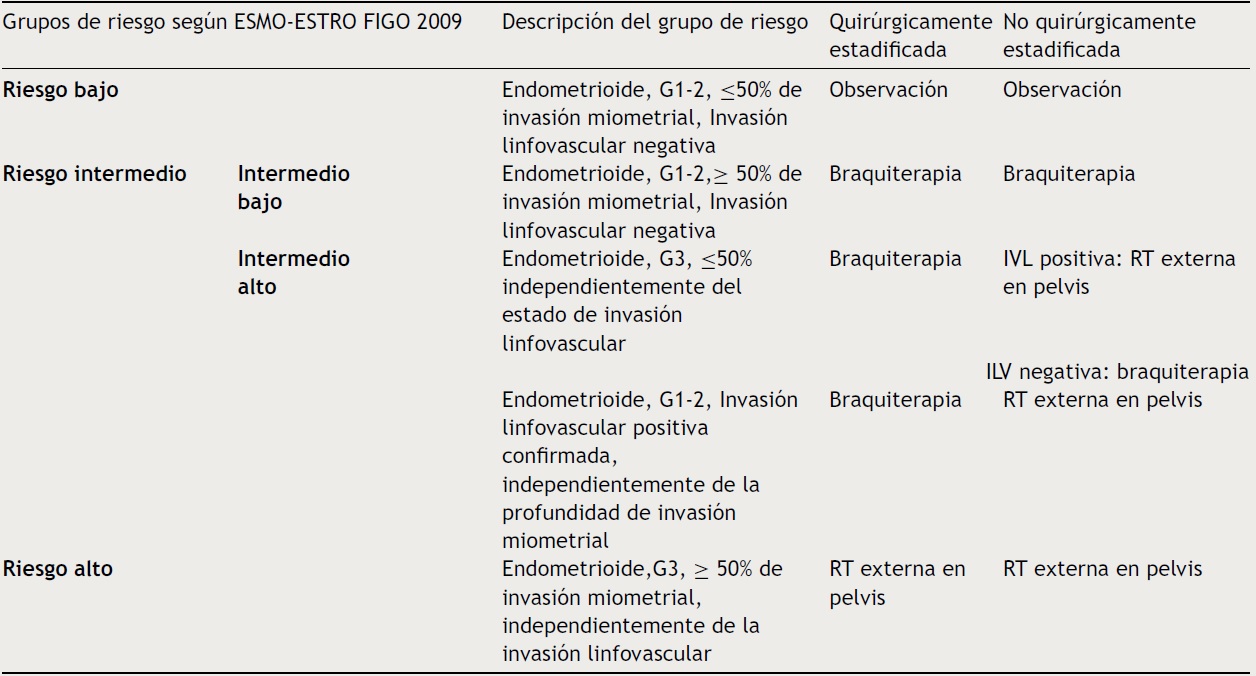 La braquiterapia adyuvante sola se recomienda en G3 con invasión linfovascular negativa, ya que disminuye la recurrencia vaginal.