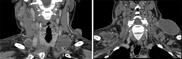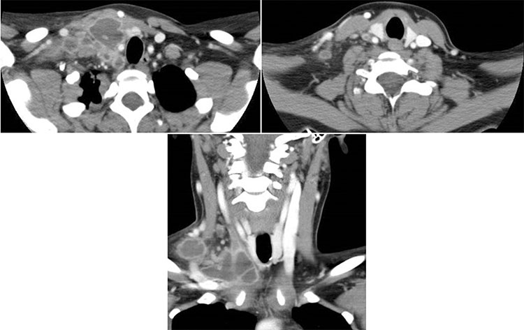 Mujer con baja de peso, dolor cervical y fiebre. Presentó durante el examen físico, adenopatías supraclaviculares palpables. Se realizó TC de cuello, destacándose en la región supraclavicular derecha y paratiroidea ipsilateral un conglomerado de adenopatías de aspecto necrótico, abscedadas, que medían hasta 7 cm de diámetro mayor. Se identificó un trombo en la vena yugular interna derecha.