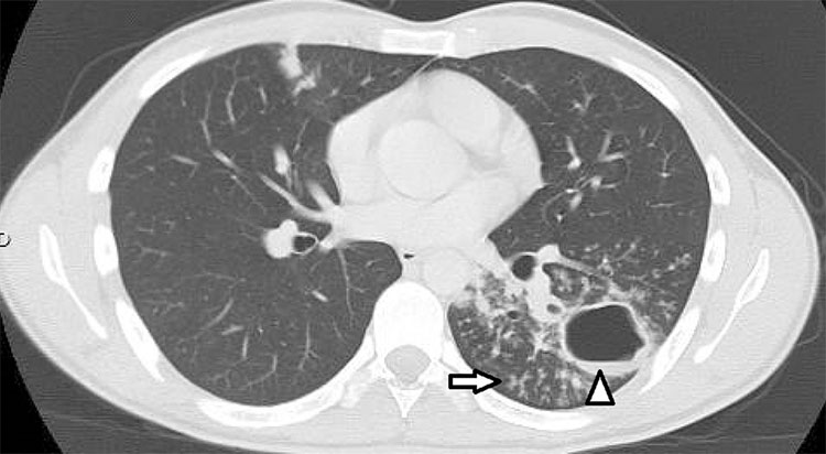 Hombre de 23 años, con cuadro febril, tos y expectoración, se solicitó TC en sospecha de TBC complicada. Se observaron opacidades nodulillares centrilobulares asociados a una lesión nodular cavitada en el lóbulo inferior izquierdo con prominentes infiltrados peribronquiales tipo "árbol en brote" (flecha) y una lesión cavitada (triángulo) de contornos irregulares que midió aproximadamente 4 cm de diámetro y presentó un nivel hidroaéreo en su interior.