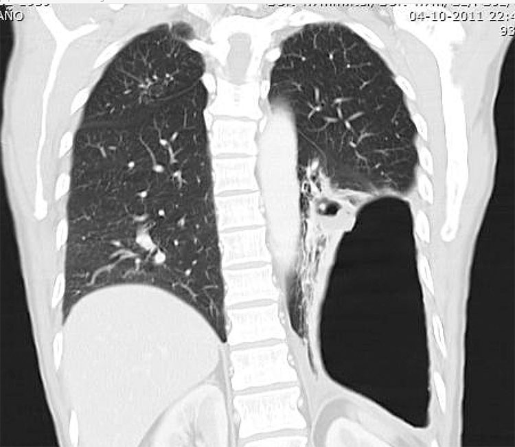 Hombre de 51 años, con antecedentes de un empiema por TBC complicada. Se solicitó TC de tórax que destacó: en relación al lobo inferior izquierdo se apreció gran cavitación con fístula broncopulmonar comunicante, paredes engrosadas en relación a bronquiectasias periféricas e imágenes hiperdensas cicatriciales. Se observaron opacidades nodulillares centrilobulares con prominentes infiltrados peribronquiales tipo "árbol en brote."