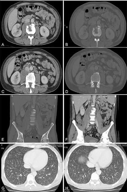 Paciente hombre, 36 años, con antecedentes de VIH, consultó por dolor y aumento de volumen testicular bilateral de aproximadamente 2 meses de evolución, se solicitó TC de abdomen y pelvis por sospecha de tumor testicular. (a, b, c y d) Lesión hipodensa en relación al músculo psoas, con realce periférico de sus bordes, y que parece venir de una lesión osteolítica bien definida que afecta el borde anterior del cuerpo vertebral de L2-L3. (e y f) En el reformateo coronal se puede ver compromiso del disco intervertebral con disminución del espacio discal L2–L3. (g y h) Imágenes predominantemente nodulares centro lobulillares, algunas de ellas con ramificaciones en patrón de árbol en brote, características de TBC.