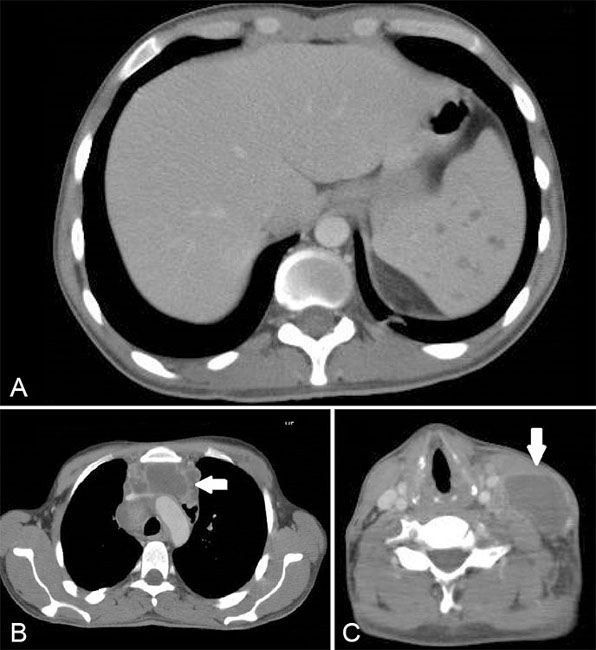 Hombre de 27 años, con VIH, se realizó estudio por tumor cervical al examen físico. Se realiza TC que destacó: (a) múltiples imágenes hipodensas esplénicas compatibles con microabscesos de diámetros fluctuantes entre 1 y 2 cm, de distribución difusa, (b) se observaron grandes conglomerados de adenopatías a nivel mediastínico peritraqueal, subcarinales y prevasculares, alcanzando en ese último un diámetro axial máximo de 8 cm (flecha) y (c) múltiples adenopatías cervicales en ambas cadenas yugulares y en el espacio cervical posterior izquierdo. Ellas presentaron centro hipodenso con realce periférico con el medio de contraste. La de mayor tamaño en el espacio cervical posterior izquierdo midió aproximadamente 4,5 x 2,7 cm en sus ejes transversos máximos (flecha).