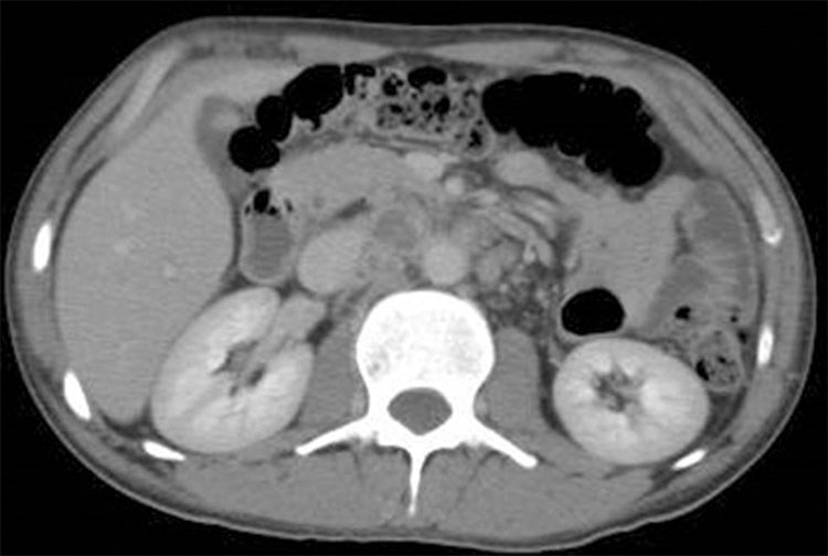 Hombre con antecedentes de virus de inmunodeficiencia humana (VIH) sumado a tuberculosis (TBC) miliar, se realizó TC de abdomen por dolor abdominal. Se destacaron múltiples adenopatías peripancreáticas con refuerzo periférico y centro hipodenso, sugerentes por contexto clínico e imagen de TBC extrapulmonar.