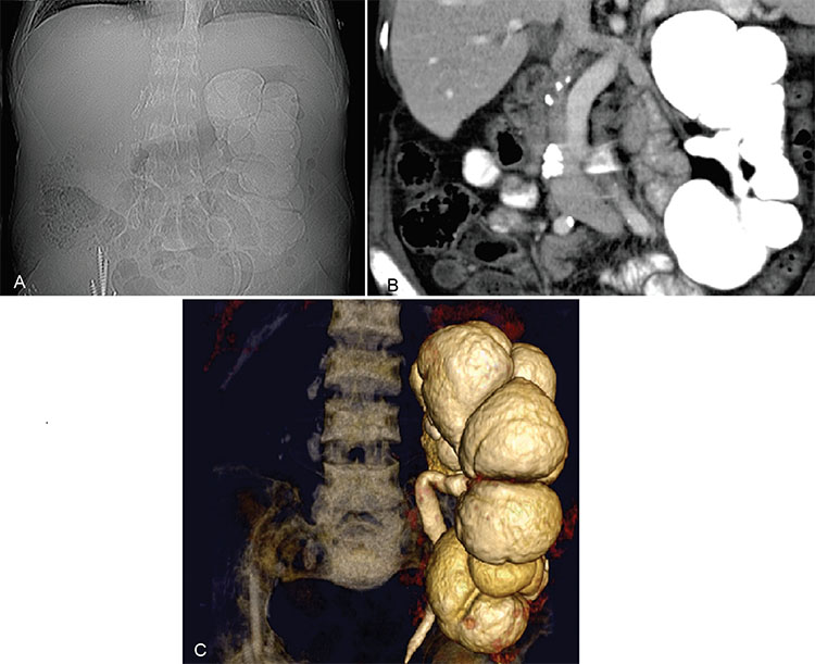 Mujer de 44 años con antecedentes de TBC pulmonar, pleural y genitourinaria, nefrectomizada derecha, enfermedad renal crónica en hemodiálisis, realizó una consulta por dolor abdominal y crisis hipertensiva secundaria. (a y b) Se realizó TC que destacó una marcada dilatación del sistema caliciliar con destrucción caseosa corticalocorticomedular y delparénquimarenal. (c) Se realizóuna reconstrucción de TC en 3D que destacó con mayor énfasis las dilataciones mencionadas. En el examen de orina se aislaron bacilos de Mycobacterium tuberculosis.