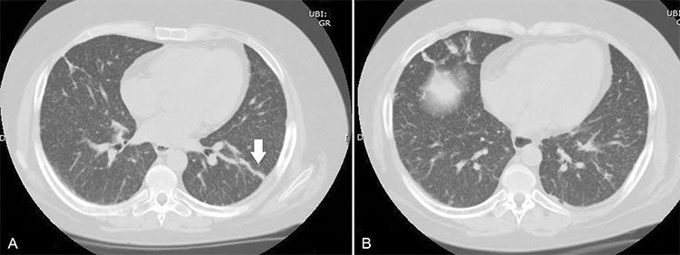 Mujer con antecedentes de lupus eritematoso sistémico en tratamiento con inmunosupresores, hospitalizada por sospecha de neumonía. Se realiza TC de tórax donde destacan: (a y b) múltiples micronódulos de distribución difusa en parénquima pulmonar. También se visualizaron algunos nódulos bilaterales, de bordes mal definidos. (a) Se visualizaron algunas imágenes lineales hiperdensas de aspecto cicatricial (flecha), que comprometen principalmente las bases pulmonares en sus porciones periféricas.