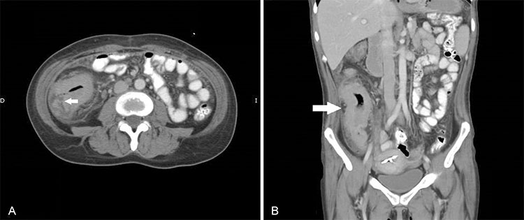 Mujer de 40 años hospitalizada por sospecha de TBC intestinal, se solicita TC que destacó: (a) severo engrosamiento parietal difuso y concéntrico del íleon distal, que no estenosa significativamente el lumen y compromete la válvula ileocecal (flecha). Existe aumento de densidad de la grasa mesentérica y pericecal adyacente con pequeñas adenopatías de baja densidad de la cadena ileocólica que miden hasta 8 mm de diámetro. (b) La pared intestinal alcanza un espesor de 13 mm y realza en forma homogénea por contraste.