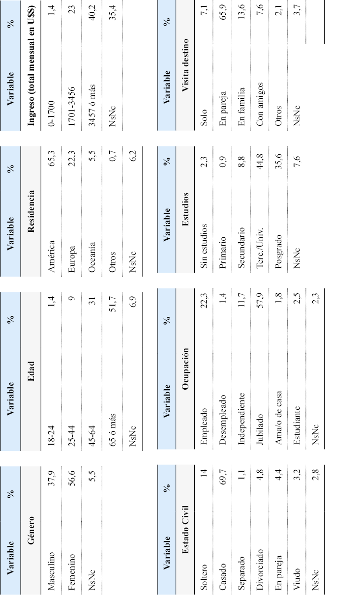 Cómo se señaló oportunamente, la muestra se conformó de 435 formularios que se completaron en el puerto de Ushuaia al momento en que los cruceristas dejaban el destino para continuar con su itinerario. El perfil sociodemográfico de los encuestados se observa en la tabla 1. En términos generales, el porcentaje más alto de los visitantes corresponde al grupo de mayor edad, prácticamente el 70 % respondió estar casado y visitar el destino con su pareja. Con respecto a la formación, la mayoría cuenta con estudios superiores y un ingreso alto.