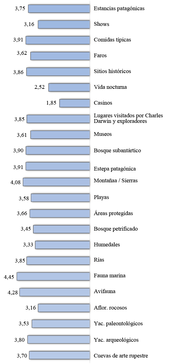 Ante la posibilidad de conocer otros puertos, se consultó qué atractivos les gustaría visitar, en virtud de su presencia en la región patagónica y atendiendo a todos los puertos y sus respectivas áreas de influencia para el excursionismo. Se propusieron un total de 23 atractivos diferenciándose en bióticos, abióticos y antrópicos que fueron valorados en una escala Likert de 5 posiciones, donde 1 representa el menor grado de interés y 5 el mayor.