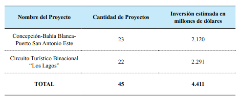 Los países que integran el Eje del Sur planifican inversiones por 4.411 millones de dólares, con 45 megaobras de integración física divididas en dos grandes grupos de proyectos, como se grafica en la siguiente tabla (IIRSA-COSIPLAN, 2017) (Tabla I):
