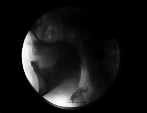 A angulação do hioide foi medida em imagens no repouso, por meio do programa Image J (National Institute of Health). O quadro selecionado para análise foi definido por sua qualidade e viabilidade de visualização nítida do osso hioide. O ângulo foi definido por duas linhas: uma tangente à margem superior do corpo do hioide e outra tangente à sua margem inferior, paralela ao plano horizontal da imagem (Figura 1). O ângulo oriundo destas duas linhas foi calculado automaticamente por meio do programa supracitado. Os valores foram comparados de forma descritiva entre pacientes sem e com aspiração traqueal.