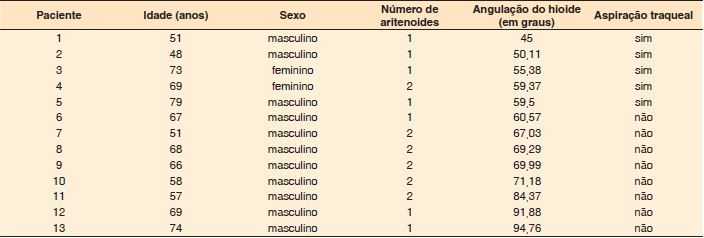 Todos os 5 pacientes com aspiração apresentaram angulação do hioide abaixo de 60º (média=53,87º ±6,26); 1 deles (20%) manteve as duas unidades cricoaritenóideas em sua reconstrução. Por outro lado, os 8 pacientes sem aspiração apresentaram angulação do osso hioide acima de 60º (média=76,13º ±12,51), 5 dos quais (62,5%) mantiveram ambas as aritenoides (Tabela 1).