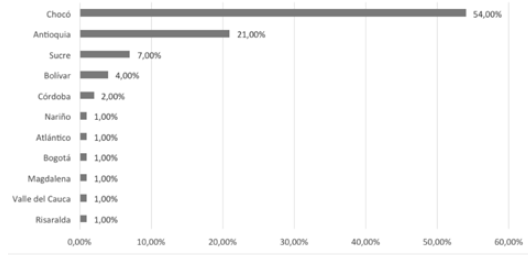 Conforme la gráfica, la mayoría de la población encuestada es originaria del departamento del Chocó, seguido de Antioquia, Sucre, Bolívar, Córdoba, Nariño, Atlántico, Bogotá, Magdalena, Valle del Cauca, Boyacá y Risaralda. El 1 % referido a Bogotá indica que se da una dinámica de redesplazamiento de la población afrocolombiana entre localidades y barrios de la ciudad.