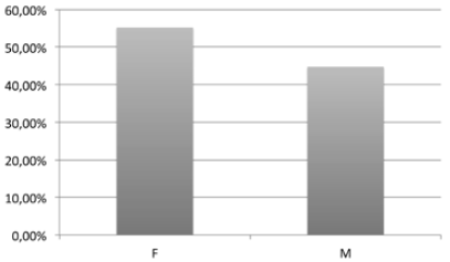 La gráfica señala que la comunidad está conformada en un 55.22 % por mujeres y en un 44.78 % por hombres. Esto significa que la mujer es el sujeto activo de concentración de la comunidad afrocolombiana.