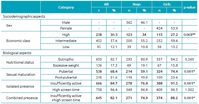 Table 1 presents the descriptive characteristics of the correlates and the isolated and combined presence of insufficient level of PA and high screen time. There were significant differences between genders for the economic class (p=0.003), sexual maturation (p=0.001), practice of PAs (p=0.01) and the combined presence of risk behaviors (p=0.001).