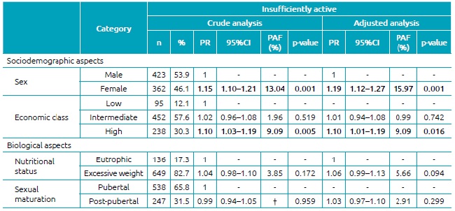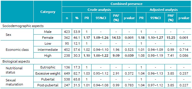 Results: Among the studied adolescents, 84.7% (n=666) were considered insufficiently active, 96.4% (n=758) reported high screen time and 82.1% (n=645) presented the combined presence of these behaviors. The female sex and the high economic status were positively associated with the insufficient level of physical activity (PR=1.19; 95% confidence interval - 95%CI 1.12-1.27; PAF=15.97 - female/adjusted; PR=1,1; 95%CI 1,01-1,19; PAF=9,09 - high/adjusted class). The female sex also was positively associated to high screen time after adjustments (PR=1.18; 95%CI 1.10-1.27; PAF=15.25). The female sex was positively associated with the combined presence of these behaviors (PR=1.18; 95%CI 1.10-1.27) with a 15.25% impact on these behaviors.