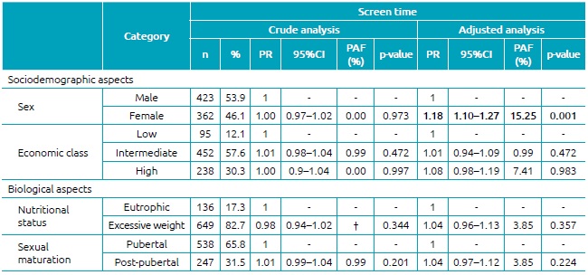 Table 2 shows the correlates associated with insufficient level of PAs in adolescents. Both in the crude and in the adjusted analyses, the female gender and the high economic classification were positively associated with insufficient levels of PA (PR=1.19; 95%CI 1.12-1.27; PAF=15.97 - female/adjusted; PR=1.1; 95%CI 1.01-1.19; PAF=9.09 - high class/adjusted). The female gender was also positively associated with high screen time (PR=1.18; 95%CI 1.10-1.27; PAF=15.25), and this association was verified only after the adjustments by the other variables in the model (Table 3).