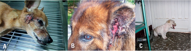 Cuando las secreciones sépticas acumuladas a presión en el oído medio no pueden drenar por el conducto auditivo causan lisis ósea y rompen la bulla timpánica, para luego drenar hacia la cara (Figura 1-A) o comprometer la articulación temporomandibular, lo que se manifiesta con dolor al masticar y renuencia a abrir la boca (Hardie etal. 2008). Es posible observar también animales en los cuales las secreciones son muy abundantes y drenan por el conducto auditivo, rebosando y manchando la cara y la región parotídea (Gotthelf 2004), como estas secreciones son de carácter séptico, la piel de la zona se reblandece y ulcera (Figura 1-B).