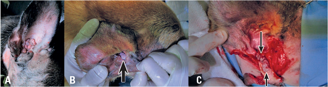 Bajo anestesia general se prepara asépticamente el campo quirúrgico, es conveniente realizar un bloqueo anestésico en los nervios auriculotemporal y auricular mayor, como lo describe Otero (2006), lo que garantiza mayor analgesia en el área. La intervención se inicia realizando una incisión alrededor del aspecto más proximal de canal auditivo, esta incisión interesa la piel y el cartílago y debe incluir el trago y el antihélix, luego se practica otra incisión que empieza desde el trago y avanza hacia abajo por todo el centro de la porción vertical del canal e involucra solo la piel. Se toma el aspecto más proximal del canal auditivo con una pinza de Allis y se realiza disección roma y cortante para separar la unión de los músculos auriculares a dicho canal, esta disección se hará muy cerca al tejido cartilaginoso para evitar el trauma neurovascular. Para este procedimiento se recomienda una tijera de tejido de puntas finas que pueda introducirse entre los músculos auriculares fácilmente para separarlos o el electro bisturí si se dispone de él. La disección avanza hasta la unión del conducto con el meato acústico externo (Figura 4-A). Una vez que se ubica el meato, se separa del canal auditivo utilizado un bisturí con hoja N°11(Figura 4-B), el primer corte se hará en el aspecto proximal de canal justo en su unión al meato y luego se continúa con cortes de tijera para acabar de separar el conducto; es normal que una pequeña porción de conducto quede unida al meato, es imprescindible retirar todo este tejido ya que el epitelio está contaminado y será la fuente de tractos fistulosos en el futuro, una de las complicaciones tardías más difíciles de resolver (Smeak 2011). Al pasar por el aspecto ventrocaudal al canal auditivo horizontal durante la disección se pondrá atención en ubicar el nervio facial para evitar lesionarlo (Figura 4-C).