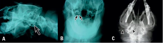El estudio radiográfico requiere sedación profunda o anestesia. Se recomiendan las proyecciones lateral oblicua del cráneo con el lado enfermo apoyado en el chasis, ventro dorsal del cráneo y frontal con la boca abierta, con el colimador centrado en la faringe y tirando de la lengua hacia afuera para eliminar la interferencia del tejido blando. Los cambios sugerentes de OM incluyen: radio-opacidad en la bulla timpánica que suele producirse porque existe pus caseificado en su interior o crecimiento de tejido granulomatoso, neoplásico o pólipos (Pratschke 2003), es posible observar también esclerosis de la pared de la bulla timpánica o lisis de esta estructura (Figura 3-A y B). Muchas veces los Rayos X hacen evidente el grado de hiperplasia y calcificación del conducto auditivo externo que caracteriza la OEC (Figura 3-C), hallazgo muy importante porque también es una indicación de la intervención quirúrgica en OEC.