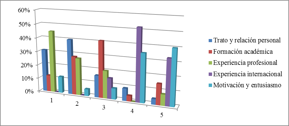 Al respecto, se observa en la figura 1 que, la Experiencia profesional y laboral, marca un punto de referencia para los estudiantes, pudiéndose asociar esto, con el hecho de la importancia de generar una marca personal fundamentada en evidencias. Igualmente, un alto porcentaje de estudiantes ubicó en segundo lugar, el Trato y la relación personal, lo que demuestra la importancia, que tiene para los estudiantes, contar con profesores que faciliten el trato y manejen siempre una buena relación personal.