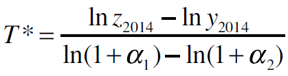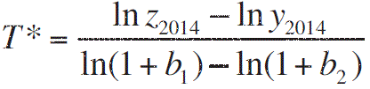 En este caso, el coeficiente “b” es la tasa de crecimiento de la economía para el período considerado. De esta forma, si se tiene dos países distintos: yt = y0 (1 + b1)t y zt = z0 (1 + b2)t , siendo que la convergencia se efectuará en el año T*. Entonces se tendría yT* = zT* , donde y2014 (1 + b1)T* = z2014 (1 + b2)T* luego se obtiene la ecuación (2) que determina el año T* positivo donde ambas economías convergen: