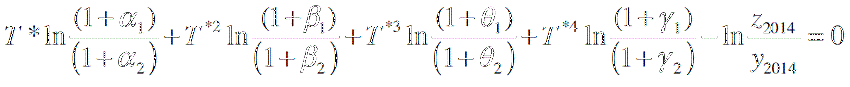 En este caso se considera que el PIB per cápita tiene la siguiente forma yt = y0 (1 + α1)t (1 + β1)t2 (1 + θ1)t3 (1 + γ1)t4 para un país y zt = z0 (1 + α2)t (1 + β2)t2 (1 + θ2)t3 (1 + γ2)t4 para el otro, luego la convergencia se efectúa en el año T* donde yT* = zT* con la siguiente igualación y2014 (1 + α1)T* (1 + β1)T*2 (1 + θ1)T*3 (1 + γ1) T*4 = z2014 (1 + α2)T* (1 + β2)T*2 (1 + θ2)T*3 (1 + γ2)T*4