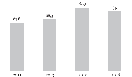 En cuanto a la profesión de los mediadores, su distribución a nivel nacional es: profesor/a47, abogado/a, asistente social, psicólogo/a, orientador/a familiar, y otra48. Todas las profesiones obtienen un grado de 'calidad alta' en el Índice ECAME (de 71 a 90 puntos). Y puede observarse que los profesionales que cuentan con el título de psicólogos son quienes obtienen el promedio más alto, con 83 puntos de 100. En segundo lugar se sitúan los asistentes sociales, con 81 puntos, y a continuación están 'otras profesiones'49. Posteriormente se encuentran los abogados, con 77 puntos, los periodistas, con 76 puntos, al igual que los profesores, y finalmente los orientadores familiares, con 74 puntos.